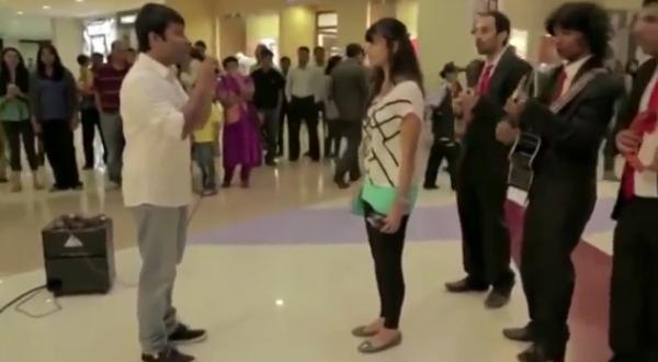 O rapaz tem tudo pensado: uma banda a tocar, um local simbólico e um poema. Mas o cenário, com uma senhora a limpar o chão e um comboio publicitário a passar, deixava no ar a ideia de que o pedido de casamento podia acabar mal.