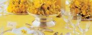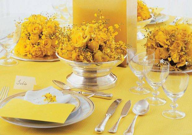 Transmite energia, alegria e um ambiente cheio de vida. Além disso, dificilmente desagrada. Ideal para noivos bem-humorados, que gostamde fugir do óbvio. É uma tendência que começou em casamentos norteamericanos, mas que também tem tudo a ver com o clima das festas noBrasil, principalmente no verão. Por ser uma tonalidade vibrante, ela fica bem se for combinada com variantes do mesmo tom. Também pode ser misturada com alguns toques de branco, marrom, vermelho-escuro ou verde-oliva para quebrar a monotonia. O importante é dosar as proporções. Se escolher um amarelo forte para as flores, reserve o claro para as toalhas. Essa cor tem tudo a ver com festas em locais fechados e ao ar livre.