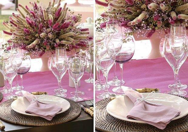 As palavras-chave desta cor, uma das mais escolhidas para as festas de casamento, são carinho, inocência, amor e generosidade. Suas combinações podem ser várias e são elas que irão personalizar o salão. “O cor-de-rosa é um tom que requer apenas um pouco de cuidado para não se tornar infantil. Por ser uma tarefa bastante sutil, o profi ssional saberá orientar as combinações ideais para o estilo da festa, pois isso dependerá de vários outros elementos, como iluminação, tecidos, formato dos docinhos e fl ores”, lembra Karin. No geral, a tonalidade tem bons resultados com lilás, azul, violeta, verde-claro, amarelo e marrom. Versátil e tradicional, permite decorações para casamentos de manhã,tarde e noite. Também não faz restrições de horários e locais da cerimônia.