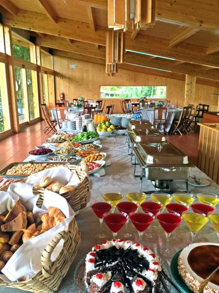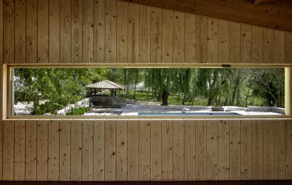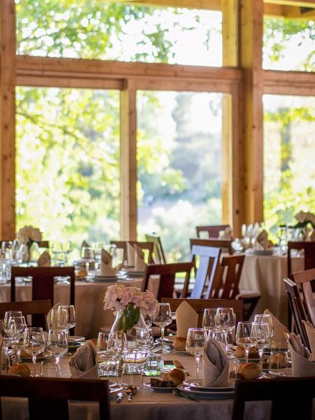 Salão para eventos com capacidade para 300 pessoas e com janelas para o exterior. Desta forma, ele encontra-se totalmente integrado na natureza envolvente e proporciona à sala muita luz natural